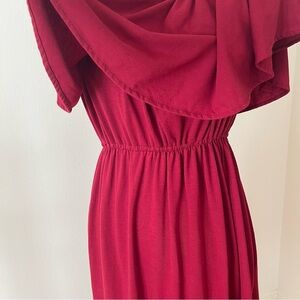 Elegant Burgundy Off-Shoulder Smocked Waist Ruffle Maxi Dress With Pockets Sz S