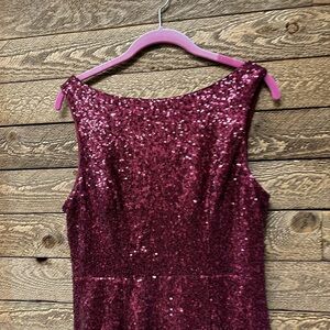 Shimmer in style with this stunning burgundy sequin gown. Perfect for special occasions, this dress offers a glamorous look with its sparkling design.