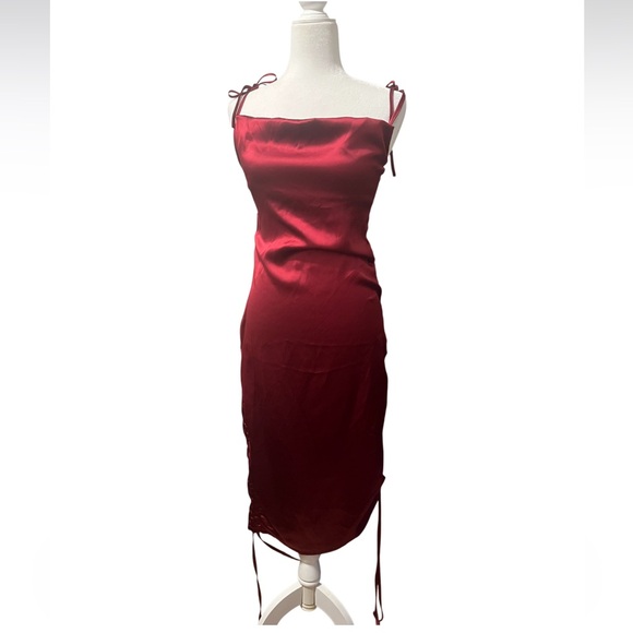 This elegant burgundy satin dress is perfect for any special occasion. Its sleek design and rich color make it a standout piece in any wardrobe. Like new