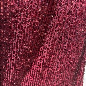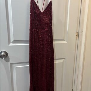 Shine at your next event with this stunning burgundy sequin prom dress. Perfect for making a statement, this dress combines elegance and glamour effortlessly. Features a lace up back and high slit for maximum flare.