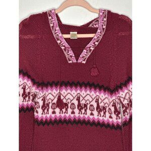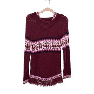 Embrace warmth and style with this elegant burgundy V-neck sweater. Featuring a unique pattern and fringe detail, it's perfect for any occasion.