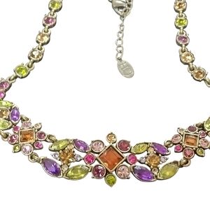 This stunning necklace features a vibrant array of gemstones in purple, orange, and green hues. Perfect for adding a pop of color to any outfit.