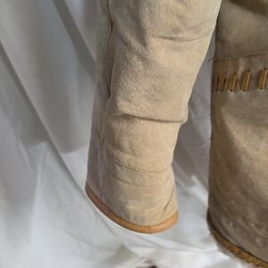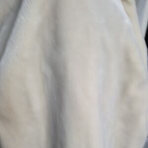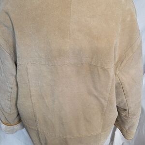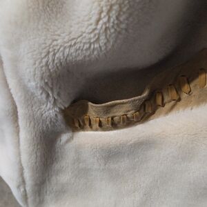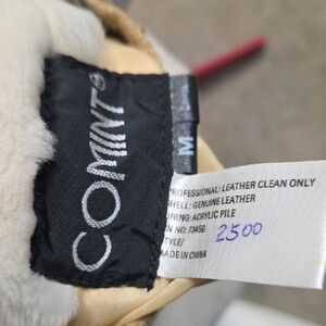 Experience the elegance of this tan leather jacket, featuring cozy cream accents. Perfect for adding a touch of sophistication to your wardrobe. Comint, Med. this does have one flaw, the pocket on the right hand side is ripped inside nothing you can see from the outside but I did try to picture it. and the bottom likes to roll up just a bit. I believe this is reversible.