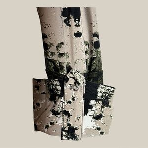 Neutral colors of black, khaki, olive green in a camo-like print on stretchy poly, satiny feel fabric. Flattering ruche embellished with clear glass jewelry cut round buttons. No size or material tags. Best guess is 6-8, flawless condition.