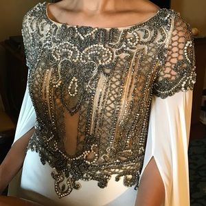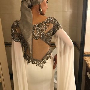 Elegant white and gunmetal cape wedding dress! This is a size 2, designed for 5’5 height. Custom made dress that cost $1,200. Beautiful and unique for your special day!