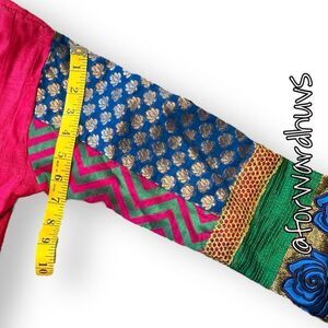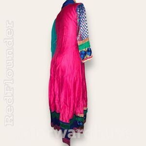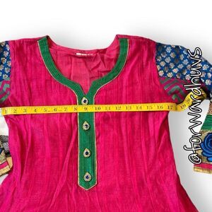 Labeled as size medium, please refer to the measurements for an accurate fit as it may run small. The set includes complementing blue pants and a beautifully coordinated green and blue dupatta.