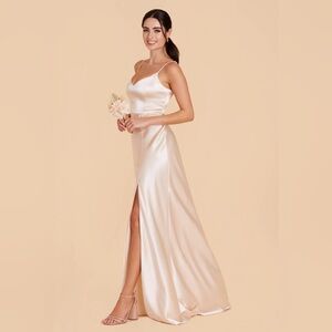 Beautiful “Jay” dress from Birdy Grey in the color “champagne” in the fabric “shiny satin”. Perfect for a bridesmaids dress, wedding guest or formal event!
