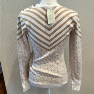 Elegant knit sweater featuring a chevron and intricate pattern design. Perfect for a stylish look.