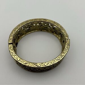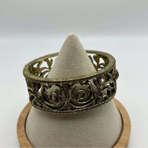 Elegant Chic Gold Tone Filigree with Leaves Hinged Bangle Bracelet