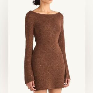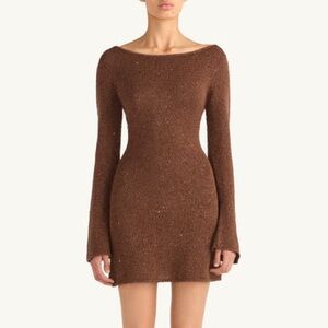 Gorgeous chocolate sequin mini dress from Asta Resort featuring long flared sleeves and a flattering mini length. Crafted with shimmering sequins that catch the light beautifully, this dress is the perfect statement piece.