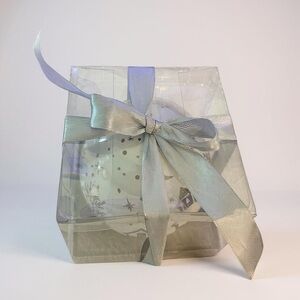 - Packaging: Clear gift box with a light blue ribbon tied in a bow
