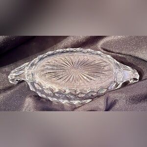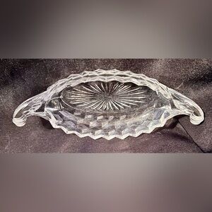 Beautiful clear glass serving dish with intricate design. Perfect for entertaining. This is an 8 inch by 3.5 inch Fostoria American Cubist Relish Dish. It is shaped like and Italian Gondola with handles on each end. It is a vintage piece made in the USA in the 1950’s in West Virginia. The pattern is highly collectible. It can also be used as a trinket dish or for display. The American pattern is faceted and captures and disperses light beautifully. No chips