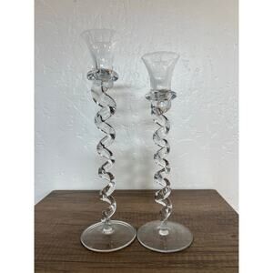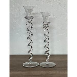 Elegant pair of clear glass spiral candle holders with a twisted stem design. Includes two coordinating sizes to display together or separately. A versatile accent for modern, classic, or minimalist décor. Fits standard taper candles.