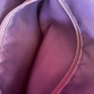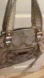Model 180709 M 13” wide, 11” height, handle 4 1/2 drop, opens very wide so roomy. Beautiful purple satin interior. In good condition leather handles a little worn, one spot you can hardly see in lower left corner front (i have the photo here) Inside purple satin liner in very good condition with lots of compartments. Great outside zip-pocket for keys phone and more. This stylish bag can take you through spring, summer and fall. Possibly winter if traveling or wearing beige, silver grey outfit.I added a new video which shows inside color more beautifully and accurately than the photos with better lighting.