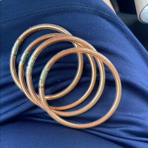 Enhance your style with this elegant set of gold bangles. Perfect for any occasion, these bangles add a touch of sophistication to your outfit.