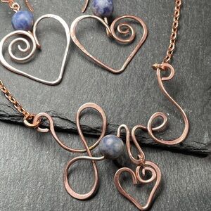 This exquisite Love Statement Jewelry set Features Elegant Hand Forged Bare Copper Heart Designs with Striking Natural Blue Sodalite Gemstone Accents. Perfect for adding a touch of sophistication to any outfit.