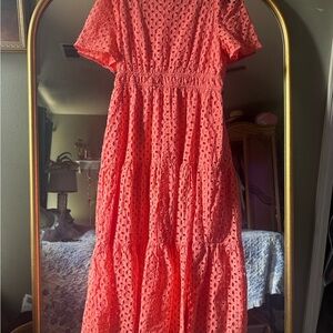 Step out in style with this elegant eyelet coral lace maxi dress. Perfect for any occasion, this dress features intricate lace detailing and a flattering silhouette. Ideal for adding a pop of color to your wardrobe. NWOT