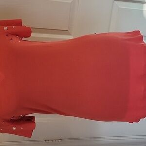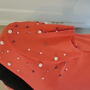 This elegant coral V-neck top features beautiful pearl accents on the sleeves, adding a touch of sophistication to your wardrobe. Perfect for any occasion. NWT, NEVER WORN AND IN EXCELLENT CONDITION!!