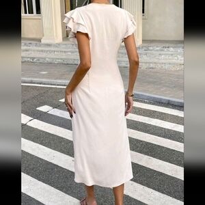 Step out in style with this elegant cream button-down dress. Perfect for any occasion, this dress features a flattering silhouette and delicate ruffle sleeves. A must-have addition to your wardrobe.