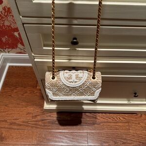 This brand new Fleming Soft Straw Small Convertible Shoulder Bag is embroidered with raffia in an oversized diamond pattern. The strap is braided with brushed gold chain - and it's convertible, so you can wear it short or long. Two interior zipper pulls wrapped.