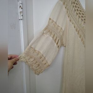 beige/ cream beach cover up/ dress with crochet in the V neck, sleeves and back. cotton blend.