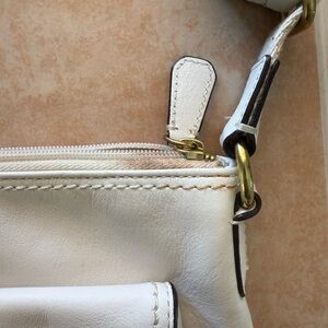 Coach Park swingpack crossbody bag in beige leather with gold tone hardware. Has a top zipper, front pocket and 1 interior open pocket. Measures approx 7" tall x 8" wide x 2" deep. Strap has a 23" drop and is adjustable. Bag is in good condition with a little rub wear and stain pictured by the zipper. Interior is clean, zipper works great. These smaller swingpack bags do not have a creed inside.