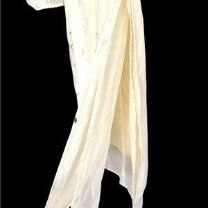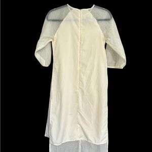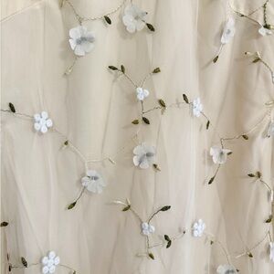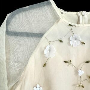 Fitted tunic with side slits, sheer sleeves, floral embroidery.