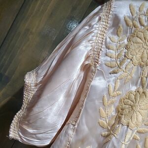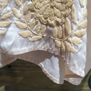 This elegant cream top features intricate floral embroidery, perfect for adding a touch of sophistication to any outfit. Ideal for both casual and formal occasions. No size tag, measures 22 inches across the chest from pit to pit estimated as extra large, no material tag. cream top with yellow gold embroidery,