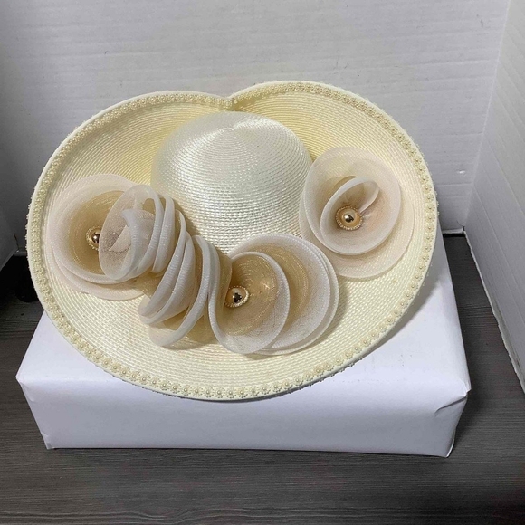 This elegant cream hat features beautiful floral accents, perfect for adding a touch of sophistication to any outfit.