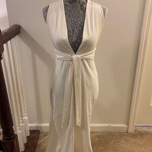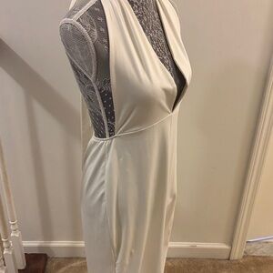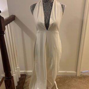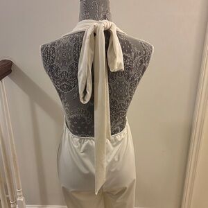 This elegant cream halter jumpsuit is perfect for any occasion. Its sleek design offers a sophisticated look.