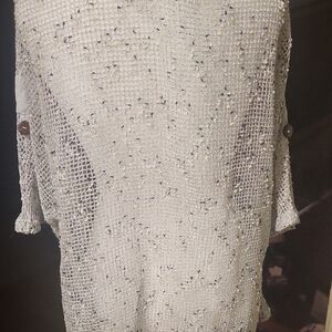 This elegant cream knit poncho features stylish wooden buttons, perfect for adding a touch of sophistication to any outfit.