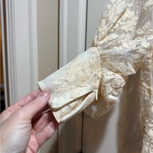 Chic cream lace blouse featuring a stylish bow. Perfect for elegant occasions.