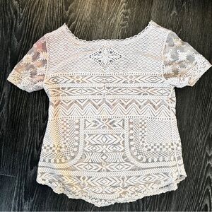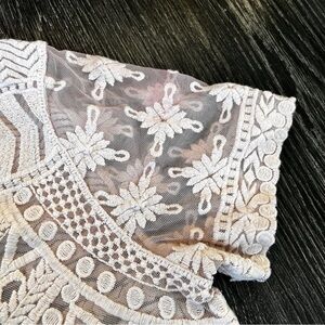 This elegant cream lace top is perfect for any occasion. Its intricate design adds a touch of sophistication to your wardrobe. In preowned good condition. Slight discoloration as shown.