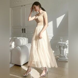 Step out in style with this elegant cream maxi skirt. Perfect for any occasion, it offers a flowing silhouette that adds grace to your look.