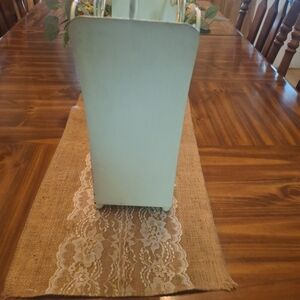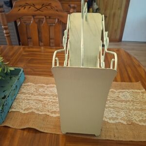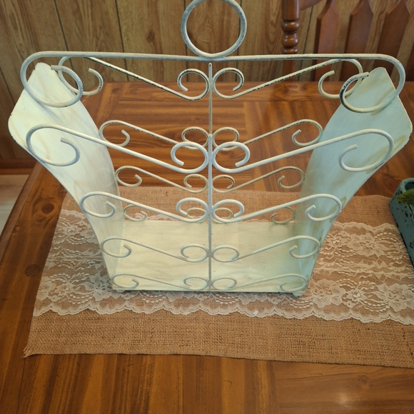 Shabby chic or farmhouse style light green metal magazine rack or organizer with intricate scroll design. Perfect for organizing magazines or newspapers or whatever your heart desires.
