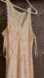 More peachy colored. Recommend dry cleaning. Altered to fit 5’2 person with heels. Some areas with stains for example the bottom of the dress shown in image
