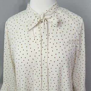 Charming cream blouse in a polka dot pattern. Features a keyhole front with tie and flared bell sleeves.