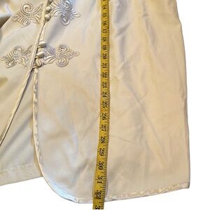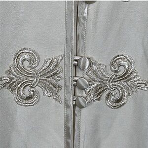 Elevate your look with this stunning cream-colored jacket from Pride & Joy. The elegant jacket features beautiful silver contrast trim and embroidered Fleur-de-Lis accents. The jacket is made from a high-quality rayon fabric and boasts silk-like covered buttons, giving it a luxurious feel.