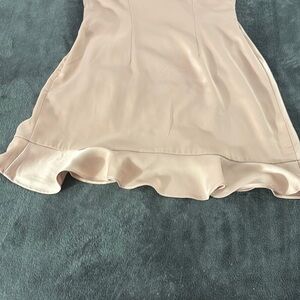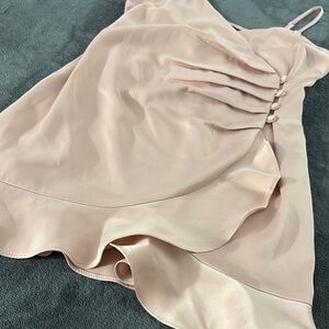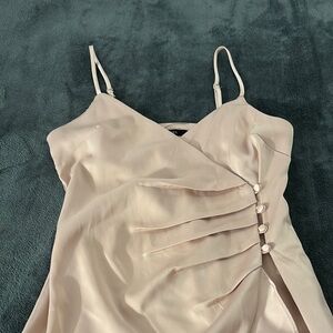 Chic sleeveless dress in a soft cream color. Features a stylish wrap design with button accents.