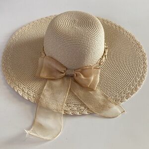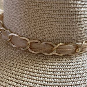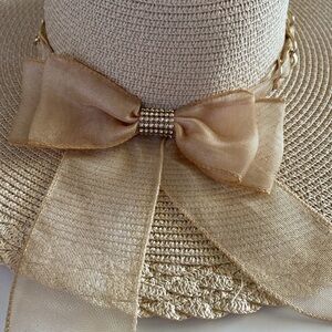 Elegant Cream Sun Hat with Gold Chain Accent and rhinestone bow