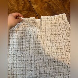 This elegant cream tweed skirt is perfect for any occasion. Its classic design offers a sophisticated look. It has a slight sparkle and a zipper up the back.