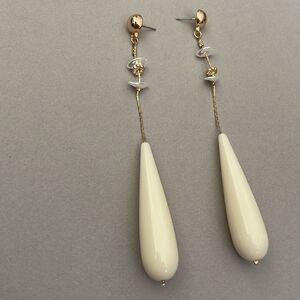 These Anthropologie earrings feature a striking cream teardrop pendant with a smooth, polished finish, elegantly suspended from a gold-toned connector. The minimalist design and substantial length make them a standout accessory for any occasion.