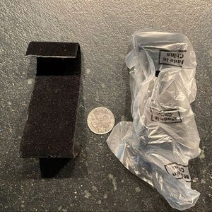 This earring display is ideal for displaying a single pair of earrings. Made from sturdy metal covered in black velvet, it features two secure holes for post, wire, or clasp earrings. It can accommodate large and small pieces, yet is small enough for easy storage when not in use. It can even be used for clip-on earrings. (This is one of five displays available separately). New and in its original unopened wrapping. The display unit used in the photos shows what they look like.