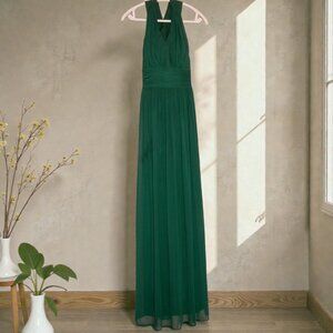 Stunning long emerald green formal gown, worn once and professionally cleaned. The detailed pleated bodice is incredibly flattering and adds beautiful structure through the waist and neckline. The A-line chiffon skirt flows gracefully and photographs beautifully — perfect for weddings, formal events, mother of the bride/groom, galas, cruises, or evening occasions.