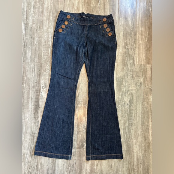 Elevate your style with these elegant dark blue flare jeans, featuring distinctive button accents for a touch of sophistication.