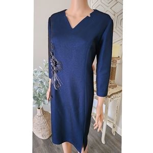 Elegant Dark Blue Metallic Flowers Details V-neck 3/4 Sleeve Sheath Dress