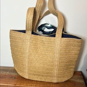Elegant Draper James Summer Straw Bag with Blue Floral Scarf