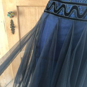 This exquisitely stitched evening gown, flows down to the ankle in multiple layers of diamond shaped black and navy tulle.