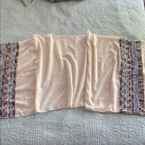 Add a touch of elegance to your outfit with this cream scarf featuring vibrant multicolor patterns. Perfect for any occasion.