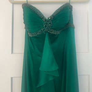 This absolutely breathtaking and elegant 100% silk emerald green gown would be a show stopper at your next event! Wear it to prom or a formal ball. It has a corset bodice for a flattering fit to accentuate the natural waist and hips, with ruffles down the middle and a leg slit. The beading on the bodice is gorgeous and sure to capture the room’s attention. There’s one bead missing as photographed.